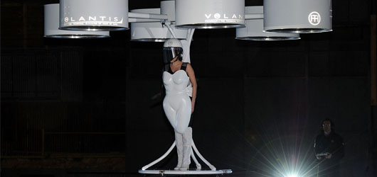 27 yaşındaki şarkıcı tanıtım sırasında da üzerindeki “Volantis” adlı elbise sayesinde kelimenin tam anlamıyla uçtu. Gaga’nın yerden havalanıp uçtuğu elbise iki yıllık bir çalışmanın ürünü. TechHaus tasarımı olan bu elbise, bedene oturan fiberoptik bir kısım ile bir kaska iliştirilmiş 6 adet aparattan oluşuyor.