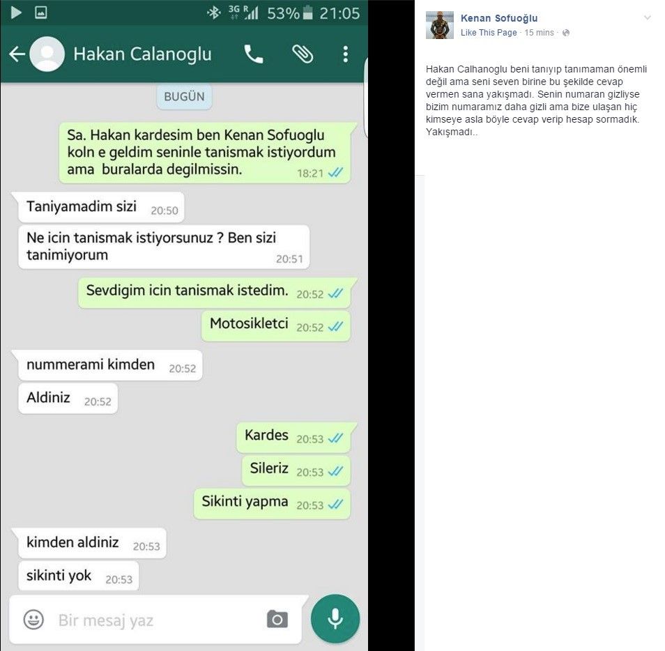 Yazışmada Kenan Sofuoğlu, Hakan Çalhanoğlu’na “Hakan kardeşim, Ben Kenan Sofuoğlu. Köln’e geldim. Seninle tanışmak istiyordum ama buralarda değilmişsin” diye yazarken, Çalhanoğlu ise “Tanıyamadım sizi. Ne için tanışmak istiyorsunuz. Ben sizi tanımıyorum” diye cevap verdi. Sofuoğlu ise, “Sevdiğim için tanışmak istedim. Motosikletçi” diye yazarken, Çalhanoğlu ise “Numaramı kimden aldınız” diye sordu. Sofuoğlu, “Kardeş sileriz sıkıntı yapma” derken, Çalhanoğlu ise, “Kimden aldınız sıkıntı yok” diye yazdı.
