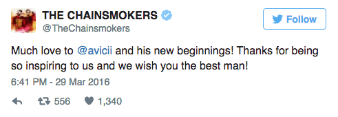 Geçtiğimiz gün canlı performanslar ve turneleri bıraktığını açıklayan Avicii, hayranlarının yanı sıra meslektaşlarını da etkiledi. Üzücü haberi uzun ve duygusal bir mektupla veren İsveçli EDM sanatçısına birçok ünlü EDM sanatçısından destek geldi.