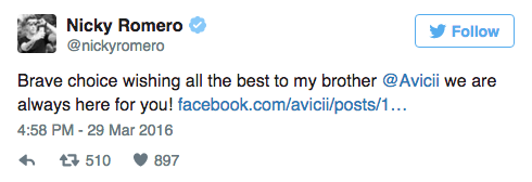 Nicky Romero ise her zaman Avicii’nin arkasında olduğunu yazdı: