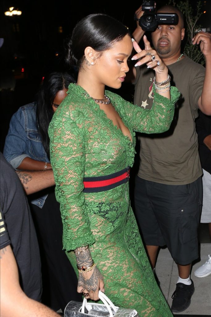 New York’ta yeşil dantelli elbisesiyle görüntülenen Rihanna sütyensiz göğüsleriyle yine gündeme oturdu.