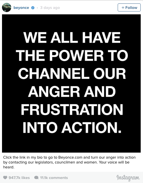 Hafta başında polis tarafından vurularak öldürülen iki Afro-Amerikalı Alton Sterling ve Philando Castile için yükselen tepkiye Beyonce de katıldı.