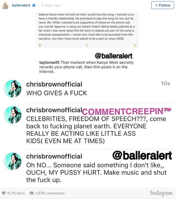Bunlardan birisi de ünlü şarkıcı Chris Brown oldu. 27 yaşındaki R&B yıldızı yakın bir zaman önce bir magazin sayfasının Taylor Swift‘in Instagram hesabında paylaştığı gönderiyi paylaşmasının ardından Chris Brown da oldukça konuşulacak yorumlarda bulundu: