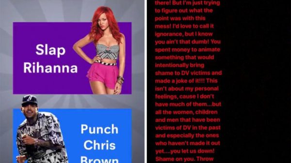 Fotoğraf ve video mesajlaşma uygulaması snapchat, geçtiğimiz gün Rihanna ve Chris Brown’un görüldüğü bir mobil oyun reklamını yayınlayarak, kullanıcılarına “Rihanna’yı tokatlamayı mı yoksa, Chris’e yumruk atmayı mı tercih edersin?” diye sordu. 2009 yılında eski erkek arkadaşı Chris Brown’ın fiziksel şiddetine maruz Rihanna, snapchat’i kadına şiddeti özendirdiği ve başına gelen olaya saygısızca davranıldığı için kınadı.