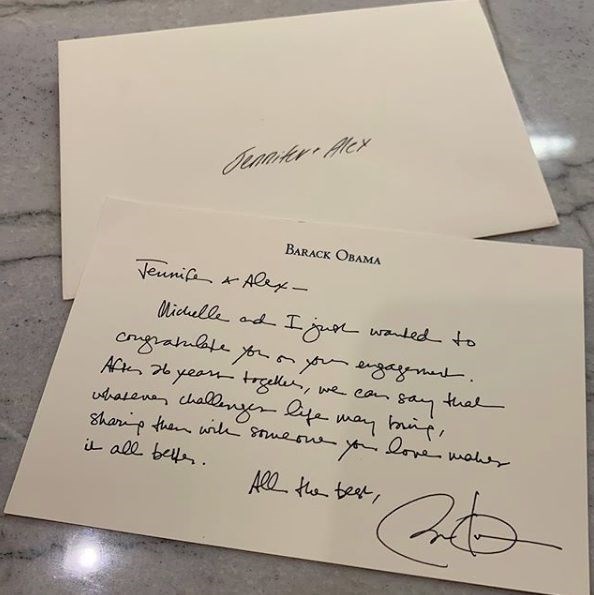 Obama çiftinden gelen kartta şu ifadeler yer alıyordu: “Jennifer ve Alex, Michelle ve ben nişanınızı kutlarız. 26 yıllık birlikteliğimizin ardından şunu söyleyebiliriz ki hayat size ne tür zorluklar getirirse getirsin, bunları sevdiğinizle paylaşmak her şeyi daha güzel kılıyor.”