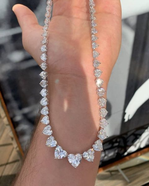 Kalp şeklindeki elmas taşlardan oluşan 100 karatlık özel sipariş kolye, Drake’in geçen doğum gününde yaptırdığı kalp şeklindeki 22 karatlık, 500 bin dolar değerindeki yüzüğüyle takım oldu.