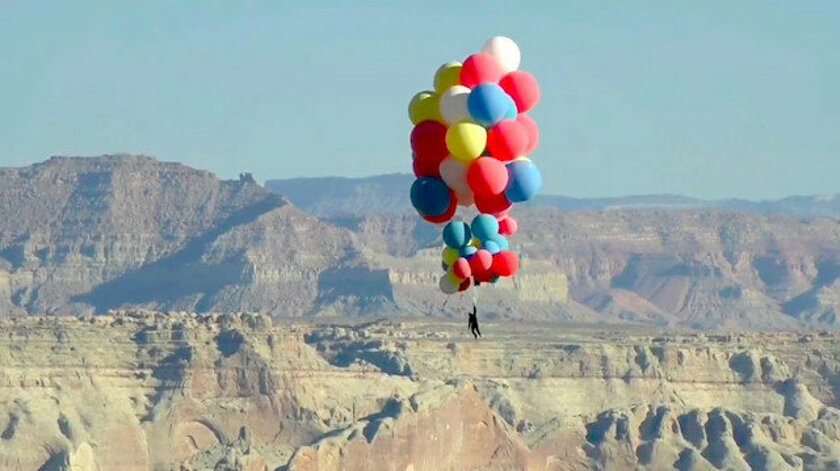 Amerika Birleşik Devletleri’nin Arizona eyaletinde Daredevil lakaplı sihirbaz David Blaine, bir kez daha imkansızı zorladı. Blaine, çocukluk hayali olan balonlarla uçma denemesini gerçekleştirmek için sabahın erken saatlerinde küçük bir iniş pistine geldi.Kızı ile vedalaşıp, yerde kalmasını sağlayan ağırlığı ona veren Blaine, yerden yükselmeye başladı. Ünlü sihirbaz, Arizona semalarında bağlı olduğu balonlar ile süzüldü.39 dakika sonra, yaklaşık 9 bin 144 metre yani Everest dağından biraz daha yüksekliğe ulaşınca balonları bırakan Blaine,, paraşüt ile güvenli bir şekilde iniş gerçekleştirdi.
