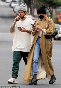 Şarkıcı Justin Bieber ve süper model karısı Hailey, Çarşamba günü Brentwood, California’da meyve suyu almak için bir markete uğradılar. Giyim tarzları birbirinden farklı olan çiftten Hailey, zeytin yeşili bir trençkot giymiş ve bunu siyah botlarla kombinlemişti. Justin ise, beyaz sade bir tshirt ile yine beyaz renk rahat ve şık görünümlü spor ayakkabı tercih etmişti.