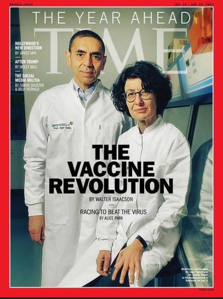 Coronavirüs aşısını geliştiren Türkçift, TIME Dergisi’nin uluslararası baskısının kapağında yer aldı. Dergi, “Aşı Devrimi” başlığını kullandı. Derginin ABD’de yayınlanan kapağında ise Amerikan Kongresi’ne düzenlenen baskının fotoğrafı yer aldı.