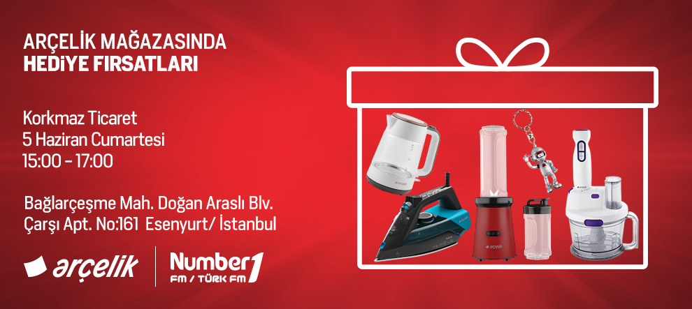 Number1 Fm ve Number1 Türk Fm, 5 Haziran Cumartesi günü Korkmaz Ticaret Arçelik Mağazası’ndan canlı yayın yapacak. 15:00 – 17:00 saatleri arasında ortak canlı yayını dinleyen ve mağazaya gelen dinleyicilerimize Arçelik’in birbirinden güzel armağanları olacak.