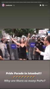 Instagram’da 16 milyon takipçisi olan Madonna, İstanbul’daki Onur Yürüyüşü’nde Alman sanatçı Liana Georgi’nin polislerin önünde yürüdüğü görüntüleri paylaşıp “Neden bu kadar çok polis var?” diye sordu.