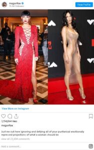 Genel olarak hayranları Fox’un hem MTV törenindeki hem de Met Gala gecesindeki görünümünü beğense de bu elbiseleri onun için uygun bulmayanlar da çıktı. Fox da bu tür fikirlere Instagram hesabı üzerinden yaptığı bir paylaşımla yanıt verdi. MTV ödül gecesi ve Met Gala’da çekilen iki fotoğrafını yan yana paylaşan Fox, “Bir kadının nasıl olması gerektiğine ilişkin tutucu, duygusal anlamda bastırılmış fikirlerinizi görmezden geliyorum ve meydan okuyorum” mesajını yazdı.