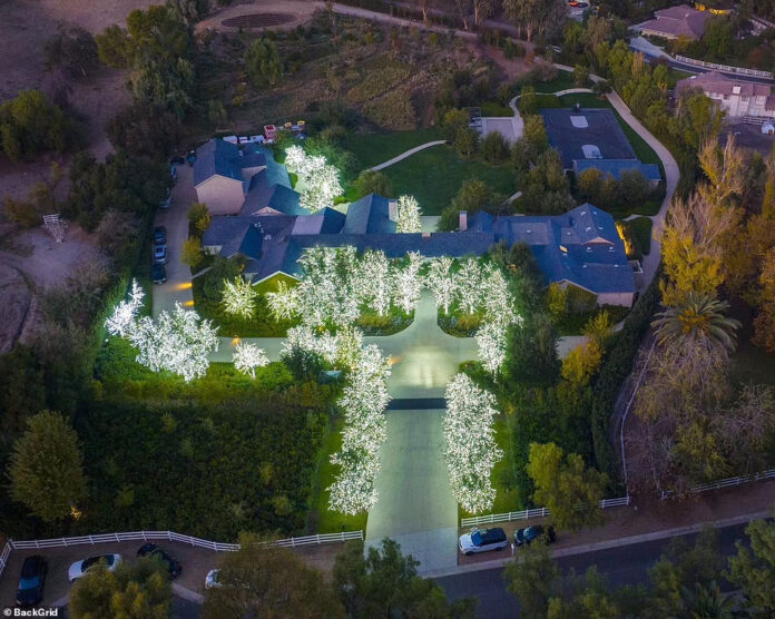 Realite yıldızının süslemeleri, geniş arazisini çevreleyen ağaçlarına yaptırdığı ışıklandırmalarıyla büyüleyici bir görüntü oluşturdu.