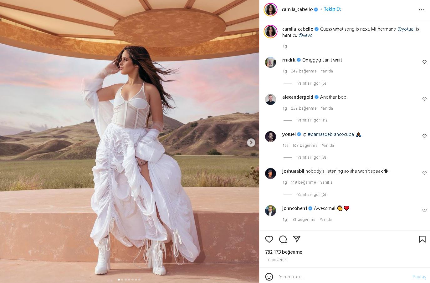 Amerikalı şarkıcı, söz yazarı ve oyuncu Camila Cabello‘dan sürpriz bir paylaşım geldi. Gabello, Kübalı sanatçı Yotuel ile ortak single’ını Instagram hesabından yayınladığı fotoğraflarla duyurdu.