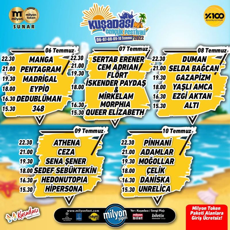 Müzik ve yaz tatilini birleştirmek isteyenler için ideal olan bu renkli program Kuşadası Gençlik Festivali 6 – 10 Temmuz tarihleri arasında gerçekleşecek.