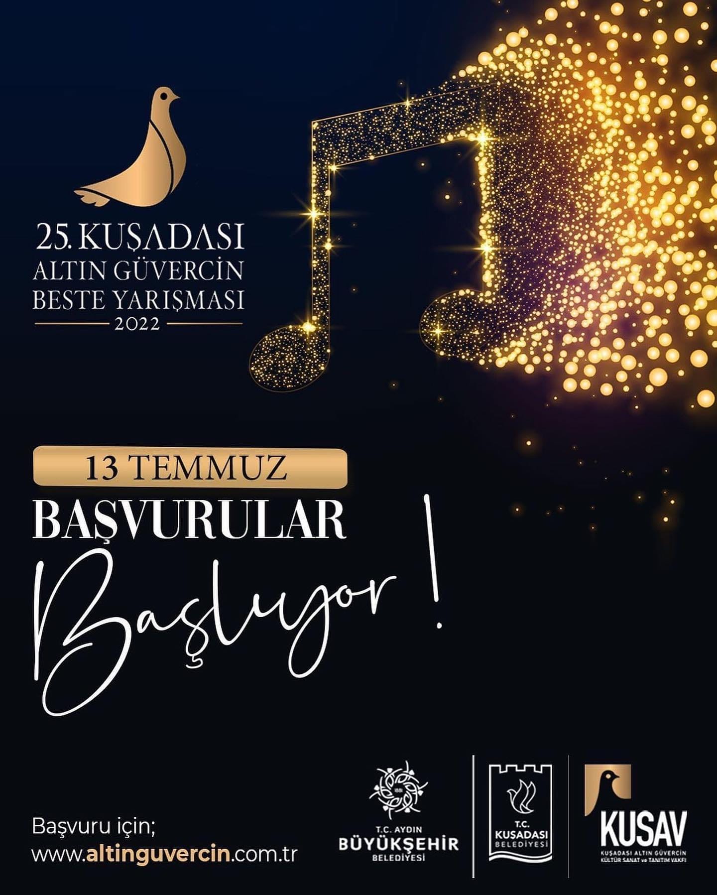 Türkiye’nin önde gelen pop müzik beste yarışması olan Kuşadası Altın Güvercin Beste Yarışması, 2022 yaz sezonunda 25. kez Kuşadalı sanatseverlerle buluşmaya hazır. Her yıl amatör ve profesyonel besteci ve söz yazarlarının katılımı ile Kuşadası Belediyesi, Aydın Büyükşehir Belediyesi ve Kuşadası Altın Güvercin Kültür Sanat ve Tanıtım Vakfı (KUSAV) iş birliğinde düzenlenen yarışma için başvurular 13-14-15 Temmuz arasında alınacak. Katılım sağlamak isteyen besteci ve söz yazarları www.altinguvercin.com.tr sitesi üzerinden başvurularını yapabilecekler. Şartnameye uygun olan besteleri inceleyecek olan ön jüri ise değerlendirmeleri yapmak için 18-19-20 Temmuz tarihlerinde toplanacak.
