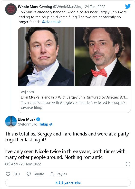 Elon Musk yaptığı projelerle adından söz ettirirken şimdi de magazin dünyasında gündem oldu. En son Twitter’la anlaşmazlığa düşen Musk, şimdi de yakın arkadaşının eşiyle birlikte yaşadığı iddialarıyla gündeme geldi. Sergey Brin’in eşi Nicole Shanahan ile ilişkisi olduğunu iddia eden bir bağlantıya yanıt veren Musk, “Bu tamamen saçmalık, aramızda romantik bir şey yaşanmadı.” açıklamalarında bulundu.
