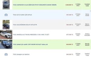 Bu ilanların bazıları projeye destek için veya ön siparişe çıktığında parasını hazırda tutarak Togg almak için bekleyenler tarafından koyulsa da bazıları ilanlarını öne çıkarmak için ‘Togg’ başlığıyla paylaşıyor.