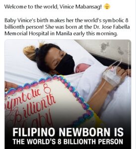 Başkent Manila’daki Dr. Jose Fabella Hastanesi‘in başhekimi Romeo Bituin, “Filipinler’de dünyanın 8 milyarıncı bebeğinin doğuşuna tanık olduk” dedi. Bituin, doğumun 23.00’da başladığını ve bebeğin iki saat sonra normal doğumla dünyaya geldiğini bildirdi.