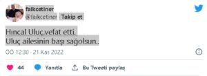 Uluç’ın yaşamını yitirdiğini, gazeteci Faik Çetiner sosyal medya hesabından yaptığı paylaşımla açıkladı.