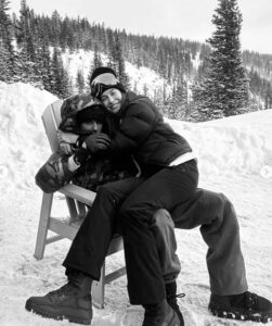 Fotoğrafta, Hailey karla kaplı dağlarla çevrili bir sandalyede Justin’in kucağında oturuyor.