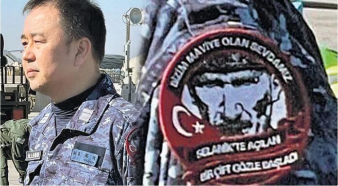Deprem bölgesine yardım getiren Japon ekibin komutanının omzundaki armada, Atatürk resmi var. Armada, “Maviye olan sevdamız Selanik’te açılan bir çift mavi gözle başladı” yazıyor.
