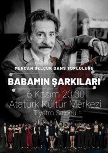 Mercan Selçuk Dans Topluluğu, ‘Babamın Şarkıları’ eseriyle 6 Kasım saat 20.30’da Atatürk Kültür Merkezi’nde sahnelenecek. Bale sanatçısı, koreograf Mercan Selçuk’un, babası Timur Selçuk’un şarkılarını klasik bale ve modern dans sanatıyla yorumladığı ‘Babamın Şarkıları’, Münir Nurettin Selçuk’tan bugüne 3 nesildir süren sanat yolculuğunun bir izdüşümü olarak izleyiciyle buluşacak.