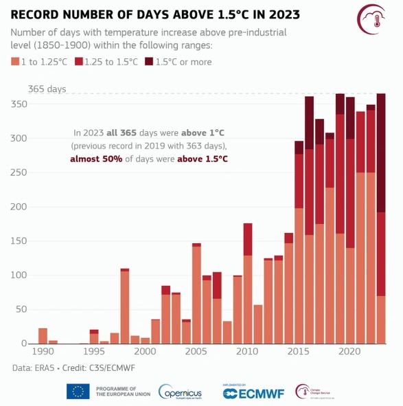2023 yılının 1850-1900 sanayi öncesi döneme kıyasla ortalama küresel sıcaklığın her gün 1 dereceyi aştığı tek yıl olduğu ifade edilen raporda, 2023 yılını neredeyse yarısının 1850-1900 sanayi öncesi döneme kıyasla 1,5 derece daha sıcak olduğu ve Kasım 2023’te iki gün sıcaklık artışının ilk kez sanayi öncesi dönem ortalamasına göre 2 dereceyi aştığı belirtildi.
