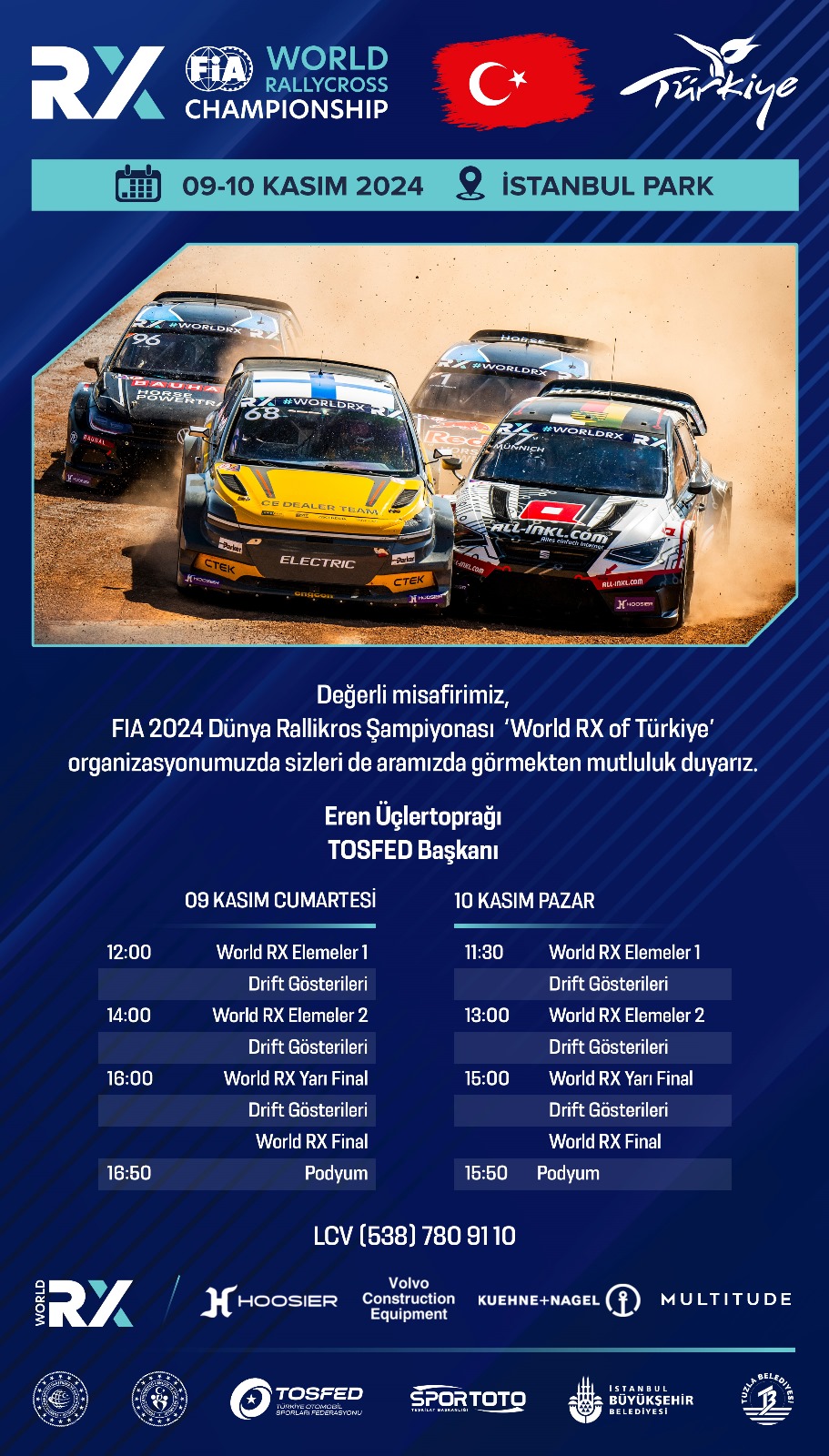 Türkiye Otomobil Sporları Federasyonu (TOSFED) ev sahipliğinde düzenlenecek FIA 2024 Dünya Rallikros Şampiyonası (World RX), 9-10 Kasım 2024 tarihlerinde İstanbul Park’ta gerçekleştirilecek. TOSFED Başkanı Eren Üçlertoprağı’nın davetiyle yarış severler, dünya çapında ünlü yarışçıların kıyasıya mücadelesine tanık olacak. Etkinlik boyunca drift gösterileri ve yarış elemeleri, yarı finaller ve final heyecanıyla dopdolu bir program ziyaretçileri bekliyor.