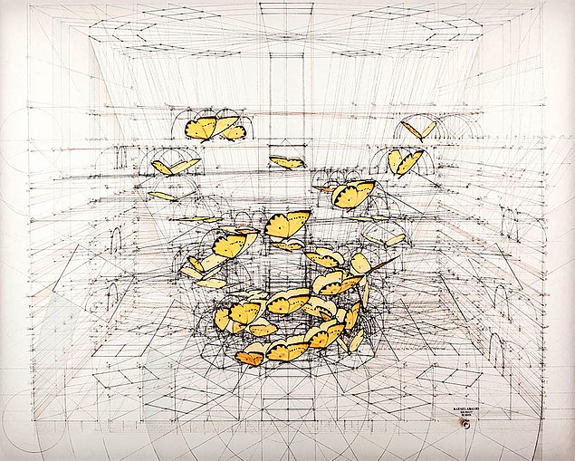 Yapım aşamasında kullanılan ve illüstrasyonlarına matematiksel bir yapı kazandıran çizgileri silmeyip,